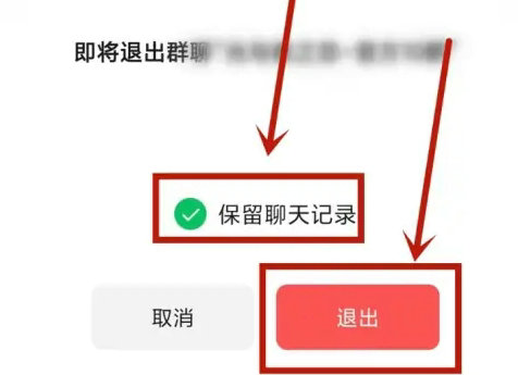 4、在功能菜单最底部找到红色字体的"退出群聊"选项。系统会弹出二次确认对话框,此处需特别注意勾选"保留聊天记录"复选框。